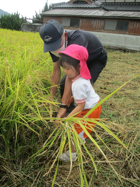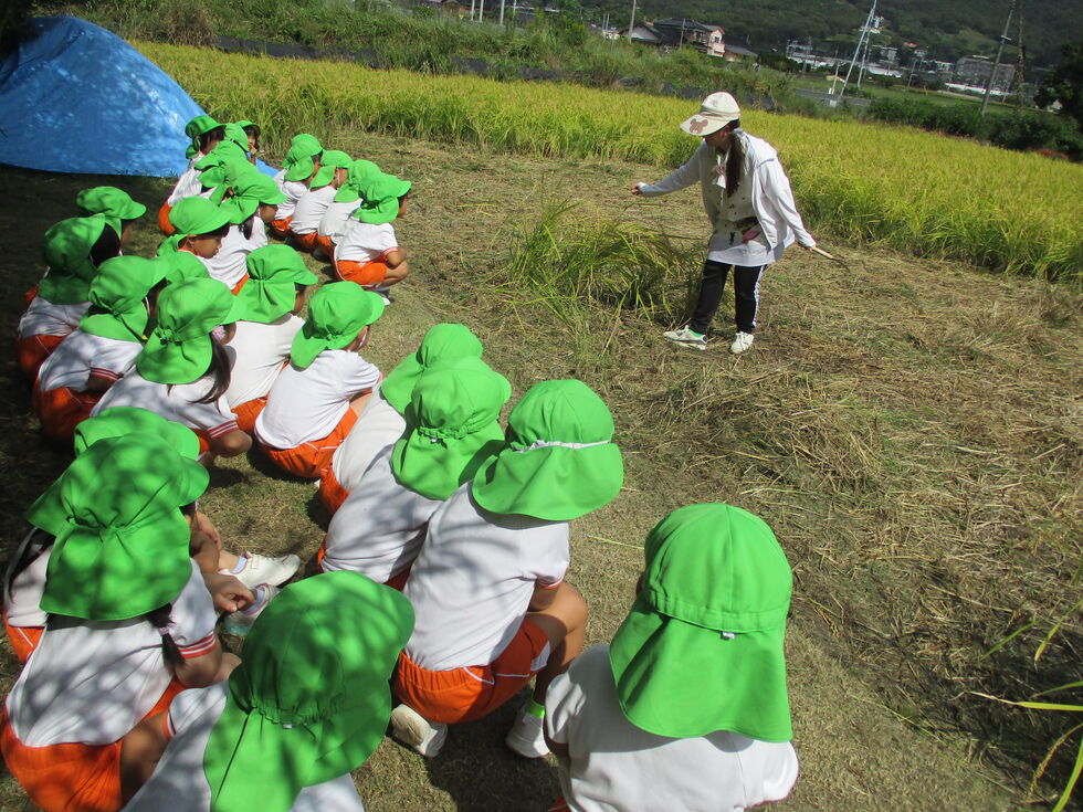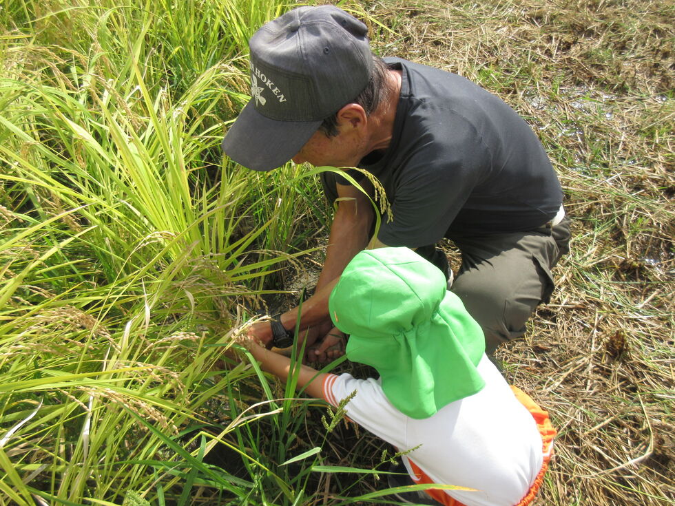 最初は泥の感触に戸惑う様子もありましたが、次第に慣れ上手にまっすぐ植えることができました。田植えを体験した後は、田んぼの端から端まで走り回ったり、ワニ歩きをしてみたり、大はしゃぎ。友達と泥のついた顔を見合わせて笑いあっていました。